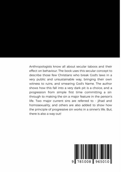 The author has used a secular term usually used in anthropology, to refer to the way some Christians can fall into devastating evil. In the book, he proposes using 'taboo' as a way of describing a Christian's fall into depravity. It is an attempt to use the word as a description. Most believers don't understand how any Christian can fall so dramatically - but, some do anyway! The author was prompted to write the book during teaching the Book of Job to fellow believers in the church. The book itself does not use Job references. 'Breaking God's Taboos' is an introduction to this new concept, possibly as a foundational work leading to a more detailed book later. The book avoids technical and academic higher concepts so that the reader can simply read it as one would a novel. Two major current problem areas are shown - homosexuality and jihad. Other topics are also mentioned. The aim is to show how a person progresses from indulging in a random sin, though to habitually indulging, to 'breaking the taboo gate'. This is when the sinner's identity is his sin.