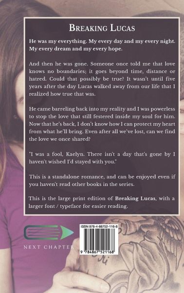 He was my everything. My every day and my every night. My every dream and my every hope. And then he was gone. Someone once told me that love knows no boundaries; it goes beyond time, distance or hatred. Could that possibly be true? It wasn't until five years after the day Lucas walked away from our life that I realized how true that was. He came barreling back into my reality and I was powerless to stop the love that still festered inside my soul for him. Now that he's back, I don't know how I can protect my heart from what he'll bring. Even after all we've lost, can we find the love we once shared? "I was a fool, Kaelyn. There isn't a day that's gone by I haven't wished I'd stayed with you." This is a standalone romance, and can be enjoyed even if you haven't read other books in the series. This is the large print edition of Breaking Lucas, with a larger font / typeface for easier reading.