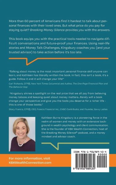 Over six in 10 Americans don't talk about money and many people would rather discuss politics and death than their finances. But what price do you pay for staying quiet? Kathleen Burns Kingsbury, a wealth psychology specialist, coach and consultant with over twenty-five years of experience empowering women, families and financial advisors to talk more openly about money provides you with the answer. Breaking Money Silence equips you with the practical tools needed to navigate difficult conversations and future-proof your finances. Discover how to identify your thoughts and beliefs about…mehr