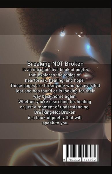 Breaking Not Broken is an introspective book of poetry that explores the topics of heartbreak, healing, and hope. These pages are for anyone who has ever felt lost and has found or is looking for their way back home again. Whether you're searching for healing or just a moment of understanding, Breaking Not Broken is a book of poetry that will speak to you.