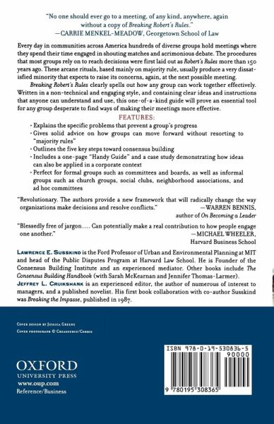 Robert's Rules of Order, written more than 150 years ago by a military man, are no longer relevant. America needs a new guide that spells out how to work together effectively in groups of all kinds, one that takes account of recent developments in the field of consensus building and dispute resolution. Enter the concensus-building approach, as introduced and explained in a step-by-step approach using realistic scenarios, by Susskind and Cruickshank.