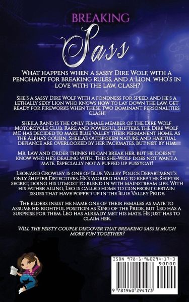 What happens when a sassy Dire Wolf, with a penchant for breaking rules, and a Lion, who's in love with the law, clash? She's a sassy Dire Wolf with a fondness for speed, and he's a lethally sexy Lion who knows how to lay down the law. Get ready for fireworks when these two dominant personalities clash! Sheila Rand is the only female member of the Dire Wolf Motorcycle Club. Rare and powerful Shifters, the Dire Wolf MC has decided to make Blue Valley their permanent home. As the Alpha's cousin, Sheila's outspoken nature and habitual defiance are overlooked by her Packmates, but not by him. Mr. Law and Order thinks he can break her, but he doesn't know who he's dealing with. This she-Wolf does not want a mate. Especially not a puffed up pussycat! Leonard Crowley is one of Blue Valley Police Department's only Shifter Detectives. He's worked hard to keep the Shifter secret, doing his utmost to blend in with mainstream life. With his father ailing, Leo is called home to confront certain issues that have popped up in the Blue Valley Pride. The elders insist he name one of their females as mate to assume his rightful position as King of the Pride, but Leo has a surprise for them. Leo has already met his mate. He just has to claim her. Will the feisty couple discover that breaking sass is much more fun together?