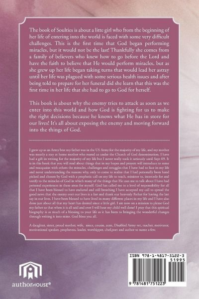 The book of Soulties is about a litte girl who from the beginning of her life of entering into the world is faced with some very difficult challenges. This is the first time that God began performing miracles, but it would not be the last! Thankfully she comes from a family of believers who knew how to go before the Lord and have the faith to believe that He would perform miracles, but as she grew up her life began taking turns that would lead her astray until her life was plagued with some serious health issues and after being told to prepare for her funeral did she learn that this was the first time in her life that she had to go to God for herself. This book is about why the enemy tries to attack as soon as we enter into this world and how God is fighting for us to make the right decisions because he knows what He has in store for our lives! It's all about exposing the enemy and moving forward into the things of God.