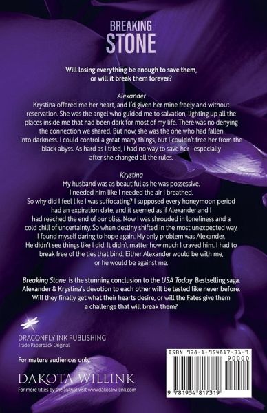 Will losing everything be enough to save them, or will it break them forever? Alexander Krystina offered me her heart, and I'd given her mine freely and without reservation. She was the angel who guided me to salvation, lighting up all the places inside me that had been dark for most of my life. There was no denying the connection we shared. But now, she was the one who had fallen into darkness. I could control a great many things, but I couldn't free her from the black abyss. As hard as I tried, I had no way to save her-especially after she changed all the rules. Krystina My husband was as beautiful as he was possessive. I needed him like I needed the air I breathed. So why did I feel like I was suffocating? I supposed every honeymoon period had an expiration date, and it seemed as if Alexander and I had reached the end of our bliss. Now I was shrouded in loneliness and a cold chill of uncertainty. So when destiny shifted in the most unexpected way, I found myself daring to hope again. My only problem was Alexander. He didn't see things like I did. It didn't matter how much I craved him. I had to break free of the ties that bind. Either Alexander would be with me, or he would be against me. Breaking Stone is the stunning conclusion to the International Bestselling series by USA Today Bestselling Author Dakota Willink. Alexander & Krystina's devotion to each other will be tested like never before. Will they finally get what their hearts desire, or will the Fates give them a challenge that will break them? TRIGGER WARNING: This book discusses pregnancy loss and infertility, and may be difficult for some readers.