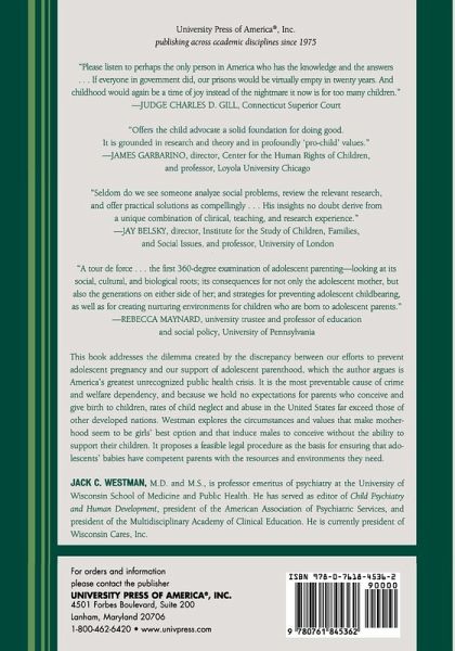 Seldom do we see someone analyze social problems, review the relevant research, and offer practical solutions as compellingly...His insights no doubt derive from a unique combination of clinical, teaching, and research experience. -- Jay Belsky, director, Institute for the Study of Children, Families, and Social Issues, and professor, University of London Offers the child advocate a solid foundation for doing good. It is grounded in research and theory and in profoundly 'pro-child' values. -- James Garbarino, director, Center for the Human Rights of Children, and professor, Loyola University Chicago Please listen to perhaps the only person in America who has the knowledge and the answers...If everyone in government did, our prisons would be virtually empty in twenty years. And, childhood would again be a time of joy, instead of the nightmare is now is for too many children. -- Judge Charles D. Gill, Connecticut Superior Court This extensive volume clearly presents, in ten parts, information that describes the situation, presents a foundation based on chaos/complexity theory, examines the developmental process of adolescence, considers the dynamics of adolescent parenthood, and explores the influence of families, communities, culture, and society on adolescent parents... The complexity of the teenage parenting problem is evident in the scope of material provided, featured here in a clearly written format with extensive references. Recommended. CHOICE, March 2010 Expanding beyond its title's scope, this holistic analysis of key issues for American adolescents benefits professionals who work in any capacity with youth and families... Westman's views could transform the approach to parenthood in America. Youth Today, September 2010 A tour de force...the first 360-degree examination of adolescent parenting - - looking at its social, cultural, and biological roots; its consequences for not only the adolescent mother, but also the generations on either side of her; and strategies for preventing adolescent childbearing, as well as for creating nurturing environments for children who are born to adolescent parents. -- Rebecca Maynard, university trustee and professor of education and social policy, University of Pennsylvania