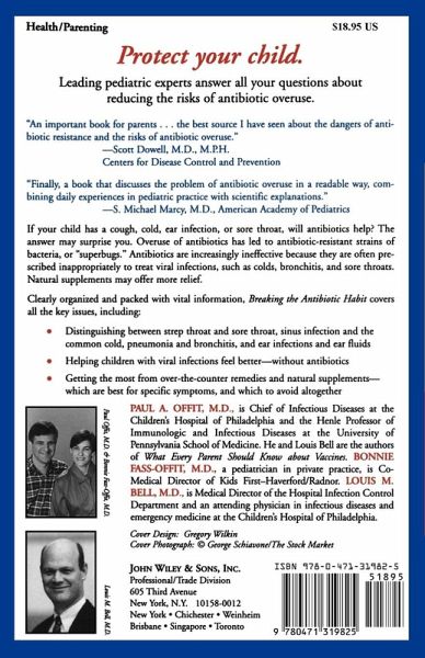 Protect your child. Leading pediatric experts answer all your questions about reducing the risks of antibiotic overuse. "An important book for parents...the best source I have seen about the dangers of antibiotic resistance and the risks of antibiotic overuse." --Scott Dowell, M.D., M.P.H. Centers for Disease Control and Prevention "Finally, a book that discusses the problem of antibiotic overuse in a readable way, combining daily experiences in pediatric practice with scientific explanations." --S. Michael Marcy, M.D., American Academy of Pediatrics If your child has a cough, cold, ear infection, or sore throat, will antibiotics help? The answer may surprise you. Overuse of antibiotics has led to antibiotic-resistant strains of bacteria, or "superbugs." Antibiotics are increasingly ineffective because they are often prescribed inappropriately to treat viral infections, such as colds, bronchitis, and sore throats. Natural supplements may offer more relief. Clearly organized and packed with vital information, Breaking the Antibiotic Habit covers all the key issues, including: * Distinguishing between strep throat and sore throat, sinus infection and the common cold, pneumonia and bronchitis, and ear infections and ear fluids * Helping children with viral infections feel better--without antibiotics * Getting the most from over-the-counter remedies and natural supplements--which are best for specific symptoms, and which to avoid altogether