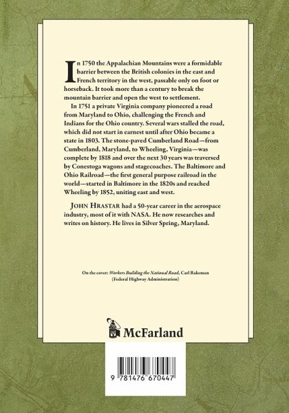 In 1750 the Appalachian Mountains were a formidable barrier between the British colonies in the east and French territory in the west, passable only on foot or horseback. It took more than a century to break the mountain barrier and open the west to settlement. In 1751 a private Virginia company pioneered a road from Maryland to Ohio, challenging the French and Indians for the Ohio country. Several wars stalled the road, which did not start in earnest until after Ohio became a state in 1803. The stone-paved Cumberland Road--from Cumberland, Maryland, to Wheeling, Virginia--was complete by 1818 and over the next 30 years was traversed by Conestoga wagons and stagecoaches. The Baltimore and Ohio Railroad--the first general purpose railroad in the world--started in Baltimore in the 1820s and reached Wheeling by 1852, uniting east and west.