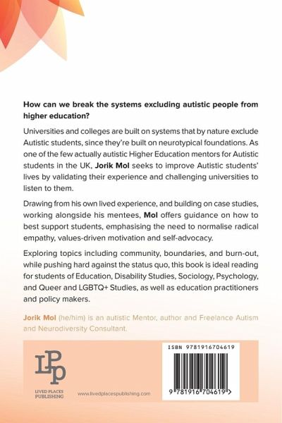 How can we break the systems excluding autistic people from higher education? Universities and colleges are built on systems that by nature exclude Autistic students, since they're built on neurotypical foundations. As one of the few actually autistic Higher Education mentors for Autistic students in the UK, Jorik Mol seeks to improve Autistic students' lives by validating their experience and challenging universities to listen to them. Drawing from his own lived experience, and building on case studies, working alongside his mentees, Mol offers guidance on how to best support students, emphasising the need to normalise radical empathy, values-driven motivation and self-advocacy. Exploring topics including community, boundaries, and burn-out, while pushing hard against the status quo, this book is ideal reading for students of Education, Disability Studies, Sociology, Psychology, and Queer and LGBTQ+ Studies, as well as education practitioners and policy makers.