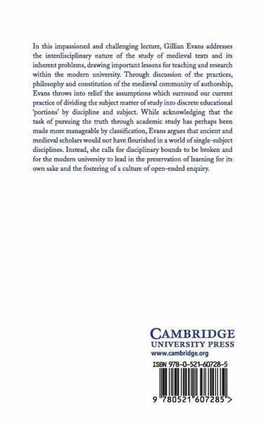 In this impassioned and challenging lecture, Gillian Evans addresses the interdisciplinary nature of the study of medieval texts and its inherent problems, drawing important lessons for teaching and research within the modern university. Through discussion of the practices, philosophy and constitution of the medieval community of authorship, Evans throws into relief the assumptions which surround our current practice of dividing the subject matter of study into discrete educational 'portions' by discipline and subject. While acknowledging that the task of pursuing the truth through academic study has perhaps been made more manageable by classification, Evans argues that ancient and medieval scholars would not have flourished in a world of single-subject disciplines. Instead, she calls for disciplinary bounds to be broken and for the modern university to lead in the preservation of learning for its own sake and the fostering of a culture of open-ended enquiry.