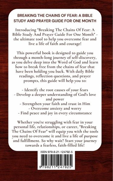 Breaking The Chains Of Fear: A Bible Study And Prayer Guide For One Month. Introducing "Breaking The Chains Of Fear: A Bible Study And Prayer Guide For One Month" - the ultimate tool to help you overcome fear and live a life of faith and courage! This powerful book is designed to guide you through a month-long journey of self-discovery, as you delve deep into the Word of God and learn how to break free from the chains of fear that have been holding you back. With daily Bible readings, reflection questions, and prayer prompts, this guide will help you to: - Identify the root causes of your fears - Develop a deeper understanding of God's love and power - Strengthen your faith and trust in Him - Overcome anxiety and worry - Find peace and joy in every circumstance Whether you're struggling with fear in your personal life, relationships, or career, "Breaking The Chains Of Fear" will equip you with the tools you need to overcome it and live a life of purpose and fulfillment. So why wait? Start your journey towards a fearless, faith-filled life! How can the Bible help us to overcome fear. The Bible is a powerful source of comfort and guidance that can help us to overcome fear in many ways. Here are some ways in which the Bible can help us to overcome fear: 1. Encourages us to trust in God: The Bible reminds us that God is always with us and that we can trust Him to take care of us. This can help us to feel more secure and less fearful, knowing that we are not alone. 2. Provides examples of courage: The Bible is full of stories of people who faced their fears and overcame them with the help of God. These stories can inspire us to do the same and give us the courage we need to face our own fears. 3. Offers comfort and peace: The Bible is filled with verses that offer comfort and peace to those who are afraid. Reading these verses can help us to feel more calm and centered, even in the midst of difficult circumstances. 4. Helps us to focus on what is importan