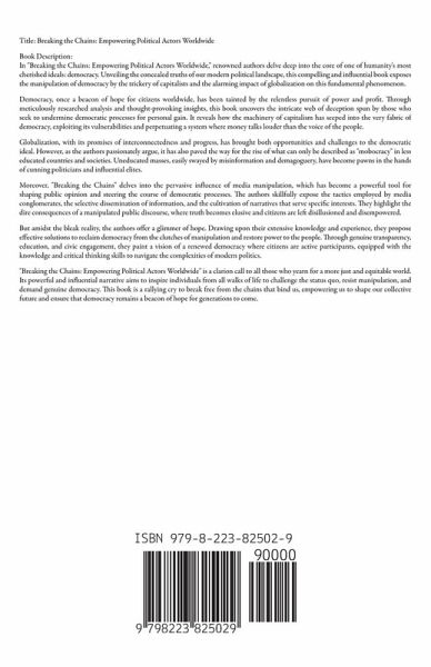 Title: Breaking the Chains: Empowering Political Actors Worldwide Book Description: In "Breaking the Chains: Empowering Political Actors Worldwide," renowned authors delve deep into the core of one of humanity's most cherished ideals: democracy. Unveiling the concealed truths of our modern political landscape, this compelling and influential book exposes the manipulation of democracy by the trickery of capitalists and the alarming impact of globalization on this fundamental phenomenon. Democracy, once a beacon of hope for citizens worldwide, has been tainted by the relentless pursuit of power and profit. Through meticulously researched analysis and thought-provoking insights, this book uncovers the intricate web of deception spun by those who seek to undermine democratic processes for personal gain. It reveals how the machinery of capitalism has seeped into the very fabric of democracy, exploiting its vulnerabilities and perpetuating a system where money talks louder than the voice of the people. Globalization, with its promises of interconnectedness and progress, has brought both opportunities and challenges to the democratic ideal. However, as the authors passionately argue, it has also paved the way for the rise of what can only be described as "mobocracy" in less educated countries and societies. Uneducated masses, easily swayed by misinformation and demagoguery, have become pawns in the hands of cunning politicians and influential elites. Moreover, "Breaking the Chains" delves into the pervasive influence of media manipulation, which has become a powerful tool for shaping public opinion and steering the course of democratic processes. The authors skillfully expose the tactics employed by media conglomerates, the selective dissemination of information, and the cultivation of narratives that serve specific interests. They highlight the dire consequences of a manipulated public discourse, where truth becomes elusive and citizens are left disillusioned and disempowered. But amidst the bleak reality, the authors offer a glimmer of hope. Drawing upon their extensive knowledge and experience, they propose effective solutions to reclaim democracy from the clutches of manipulation and restore power to the people. Through genuine transparency, education, and civic engagement, they paint a vision of a renewed democracy where citizens are active participants, equipped with the knowledge and critical thinking skills to navigate the complexities of modern politics. "Breaking the Chains: Empowering Political Actors Worldwide" is a clarion call to all those who yearn for a more just and equitable world. Its powerful and influential narrative aims to inspire individuals from all walks of life to challenge the status quo, resist manipulation, and demand genuine democracy. This book is a rallying cry to break free from the chains that bind us, empowering us to shape our collective future and ensure that democracy remains a beacon of hope for generations to come.