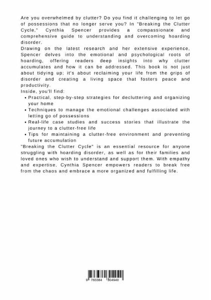Are you overwhelmed by clutter? Do you find it challenging to let go of possessions that no longer serve you? In "Breaking the Clutter Cycle," Cynthia Spencer provides a compassionate and comprehensive guide to understanding and overcoming hoarding disorder.Drawing on the latest research and her extensive experience, Spencer delves into the emotional and psychological roots of hoarding, offering readers deep insights into why clutter accumulates and how it can be addressed. This book is not just about tidying up; it's about reclaiming your life from the grips of disorder and creating a living space that fosters peace and productivity.Inside, you'll find:Practical, step-by-step strategies for decluttering and organizing your homeTechniques to manage the emotional challenges associated with letting go of possessionsReal-life case studies and success stories that illustrate the journey to a clutter-free lifeTips for maintaining a clutter-free environment and preventing future accumulation"Breaking the Clutter Cycle" is an essential resource for anyone struggling with hoarding disorder, as well as for their families and loved ones who wish to understand and support them. With empathy and expertise, Cynthia Spencer empowers readers to break free from the chaos and embrace a more organized and fulfilling life.