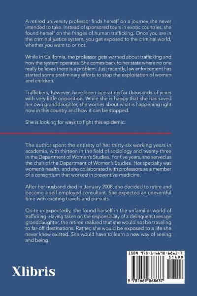 A retired university professor finds herself on a journey she never intended to take. Instead of sponsored tours in exotic countries, she found herself on the fringes of human trafficking. Once you are in the criminal justice system, you get exposed to the criminal world, whether you want to or not. While in California, the professor gets warned about trafficking and how the system operates. She comes back to her state where no one really believes there is a problem. Just recently, law enforcement has started some preliminary efforts to stop the exploitation of women and children. Traffickers, however, have been operating for thousands of years with very little opposition. While she is happy that she has saved her own granddaughter, she worries about what is happening right now in this country and how it can be stopped. She is looking for ways to fight this epidemic.