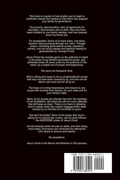One hundred prayers for African Americans to use to help spiritually break off generational issues caused by slavery in the United States. By turning their wills over to God, and choosing to forgive past atrocities in their family's personal history, God-willing, the reader will begin to find release from specific trappings that have plagued their family for years.