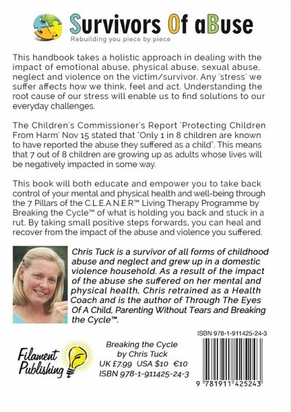 This handbook takes a holistic approach in dealing with the impact of emotional abuse, physical abuse, sexual abuse, neglect and violence on the victim/survivor. Any 'stress' we suffer affects how we think, feel and act. Understanding the root cause of our stress will enable us to find solutions to our everyday challenges. The Children's Commissioner's Report 'Protecting Children From Harm' Nov 15 stated that "Only 1 in 8 children are known to have reported the abuse they suffered as a child". This means that 7 out of 8 children are growing up as adults whose lives will be negatively impacted in some way. This book will both educate and empower you to take back control of your mental and physical health and well-being through the 7 Pillars of the C.L.E.A.N.E.R(TM) Living Therapy Programme by Breaking the Cycle(TM) of what is holding you back and stuck in a rut. By taking small positive steps forwards, you can heal and recover from the impact of the abuse and violence you suffered.