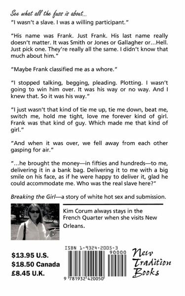 See what all the fuss is about. "I wasn't a slave. I was a willing participant." "His name was Frank. Just Frank. His last name really doesn't matter. It was Smith or Jones or Gallagher or... Hell. Just pick one. They're really all the same. I didn't know that much about him." "Maybe Frank classified me as a whore." "I stopped talking, begging, pleading. Plotting. I wasn't going to win him over. It was his way or no way. And I knew that. So it was his way." "I just wasn't that kind of tie me up, tie me down, beat me, switch me, hold me tight, love me forever' kind of girl. Frank was that kind of guy. Which made me that kind of girl." "And when it was over, we fell away from each other gasping for air." ".he brought the money-in fifties and hundreds-to me, delivering it in a bank bag. Delivering it to me with a big smile on his face, as if he were happy to deliver it, glad he could accommodate me. Who was the real slave here?" Breaking the Girl-a story of white hot sex and submission.
