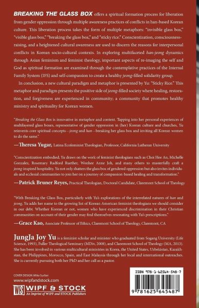 Breaking the Glass Box includes spiritual formation process for liberation from gender oppression through multiple awareness practices of conflicts in han-based Korean culture of society and church. The metaphor has multiple liberation process: ""invisible glass box,"" ""visible glass box,"" ""breaking the glass box,"" and ""sticky rice."" This liberation process includes consicentization, consciousness-raising, and a heightened cultural awareness in discerning the reasons of interpersonal conflicts in Korean socio-cultural contexts. By exploring the multi-faceted han-jeong dynamics with Feminist theology and Asian Feminism, the important aspects of re-imaging the self and God as spiritual formation have been examined with contemplative practices of Internal Family System (IFS) and self-compassion to create the healthy jeong-filled solidarity group. The ""sticky rice"" is a new cultural paradigm for Korean women's jeong-filled hospitality. The broken pieces of the glass box will be transformed into the grains of rice by the positive jeong-filled hospitality of cooking sticky rice. In the solidarity group of jeong-filled hospitality, represented by rice ready to cook a serving of delicious sticky rice, people can enjoy the fellowship of healing, forgiving, and reconciling of the sticky rice. These images are intended to promote a healthy community of ministry and spirituality for Korean women.