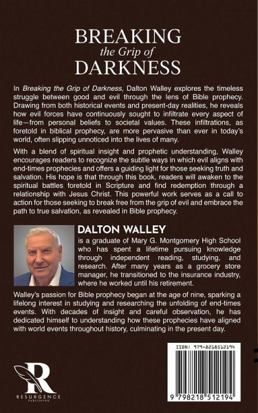 In Breaking the Grip of Darkness, Dalton Walley explores the timeless struggle between good and evil through the lens of Bible prophecy. Drawing from both historical events and present-day realities, he reveals how evil forces have continuously sought to infiltrate every aspect of life-from personal beliefs to societal values. These infiltrations, as foretold in biblical prophecy, are more pervasive than ever in today's world, often slipping unnoticed into the lives of many. With a blend of spiritual insight and prophetic understanding, Walley encourages readers to recognize the subtle ways in which evil aligns with end-times prophecies and offers a guiding light for those seeking truth and salvation. His hope is that through this book, readers will awaken to the spiritual battles foretold in Scripture and find redemption through a relationship with Jesus Christ. This powerful work serves as a call to action for those seeking to break free from the grip of evil and embrace the path to true salvation, as revealed in Bible prophecy.