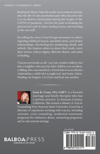 In Breaking the Illusion, author Gaea K. Coon shares her intimate journey, the story of a psychotherapist who discovers she is in an abusive relationship during the height of the COVID-19 pandemic. She chronicles her path in breaking the generational cycle of abuse, healing trauma, and returning to her true self. By telling her story, Coon brings awareness to others regarding childhood trauma, narcissistic abuse, and abusive relationships, chronicling her awakening, death, and rebirth. She inspires others to share their truth, voice their stories, reduce stigma, alleviate shame, and assist in healing. Trauma surrounds us all-not just combat soldiers, but also a neighbor who just lost their child in a car accident, a sibling who was assaulted, a friend who is in an abusive relationship, a child who is neglected, and many others. But healing can happen, and healthier relationships can be formed.