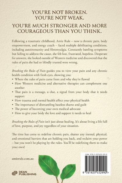 You're not broken.You're not weak.You're much stronger and more courageous than You think. Following a traumatic childhood, Amie Rule - now a chronic pain, body empowerment, and energy coach - faced multiple debilitating conditions, including autoimmunity and fibromyalgia. Constantly battling symptoms but failing to address the cause, she felt lost, frustrated, hopeless. Desperate for answers, she looked outside of Western medicine and discovered that the rules of pain she had so blindly trusted were wrong. Breaking the Rules of Pain guides you to view your pain and any chronic health condition with fresh eyes, showing you: Where the rules of pain came from and why they're flawed How Western medicine and alternative therapies can complement one another That pain is a message, a clue, a signal from your body that it needs support How trauma and mental health affect your physical health The importance of dismantling baseless shame and guilt The power of becoming your own medical advocate How to give your body the love and support it needs to heal Breaking the Rules of Pain isn't just about healing. It's about living a life full of love, purpose, and joy regardless of your situation. The time has come to redefine chronic pain, shatter any mental, physical, and emotional barriers that are holding you back, and reclaim your power - but you won't be playing by the rules. You'll be redefining them to make your own!