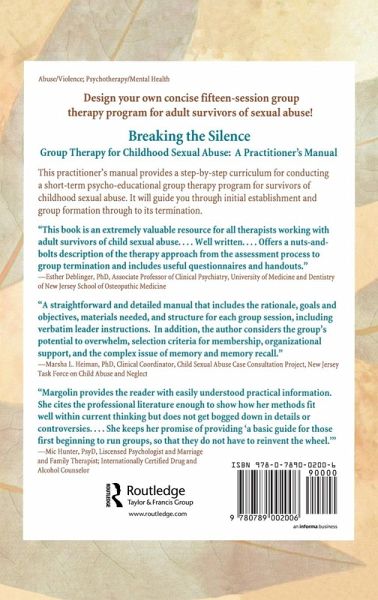 A program you can use for time limited clients suffering from sexual abuse!Breaking the Silence: Group Therapy for Childhood Sexual Abuse guides you through initial establishment and group formation to its termination. The step-by-step approach outlines themes and issues common to this population, raises pertinent questions, and highlights common pitfalls or problem areas in conducting therapy. You'll discover innovative ways to work with survivors of childhood sexual abuse by addressing these key therapy issues: issues of trust, sexuality, and disclosure family dynamics emotional expression transference/countertransference male survivors group sessions the impact of abuse a concise fifteen-session, time-limited, psycho-educational group therapy program for adult survivors of sexual abuse The program planning approach described in Breaking the Silence allows you to adapt the program to meet your individual clients'needs. The concise fifteen-session, time-limited psycho-educational group therapy program for adult survivors of sexual abuse is designed to therapeutically address the long-term sequelae associated with a past history of child abuse. The literature review of childhood sexual abuse treatment, along with this program and the invaluable sections on male survivors, sexuality, and other areas dealing with the emotional repercussions of childhood sexual abuse, are invaluable sources of information for helping survivors develop and maintain healthy relationships and balanced lives.