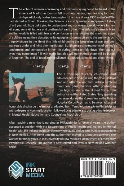 The echo of women screaming and children crying could be heard in the streets of Madrid as bombs fell crushing building and leaving torn and disfigured bloody bodies hanging from the ruins. It was 1930 and a Civil War had started in Spain. Breaking the Silence is a vividly realistic and powerful story of a 6 year old little girl trying to understand and survive in a world where fathers kill sons, sons kill fathers and brothers kill each other. The little girl's name is Mari, and her world is filled with fear and confusion as she imitates the marching steps of soldiers using their descriptive language and names given to the enemy. Much tragedy occurs in the life of this little child during the long years of war and post war years under and mind altering dictator. But there are also moments of comedy, tenderness and compassion in her life during those terrible days. The reader's eyes may sometimes fill with tears, but also will sometimes there will be bursts of laughter. The end of Breaking the Silence is both unexpected and electrifying.
