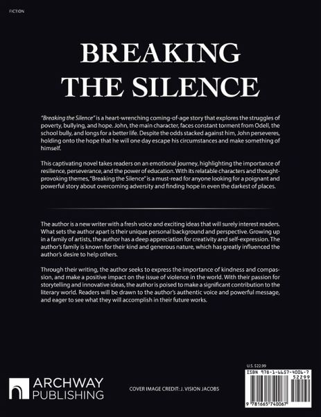 "Breaking the Silence" is a heart-wrenching coming-of-age story that explores the struggles of poverty, bullying, and hope. John, the main character, faces constant torment from Odell, the school bully, and longs for a better life. Despite the odds stacked against him, John perseveres, holding onto the hope that he will one day escape his circumstances and make something of himself. This captivating novel takes readers on an emotional journey, highlighting the importance of resilience, perseverance, and the power of education. With its relatable characters and thought-provoking themes, "Breaking the Silence" is a must-read for anyone looking for a poignant and powerful story about overcoming adversity and finding hope in even the darkest of places.