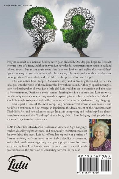 Imagine yourself as a normal, healthy seven-year-old child. One day you begin to feel sick, showing signs of a fever, and thinking you just have the flu, your parents tuck you into bed and tell you to rest. But as you awake some time later, you look up and realize that your father's lips are moving but you cannot hear what he is saying. The music and sounds around you are no longer there. You are deaf, and your life has abruptly and forever changed. This was author Lois Hooper Diamond's reality, and in Breaking the Sound Barrier, she takes you into the world of the millions who live without sound. Although spinal meningitis took her hearing when she was just a little girl, Lois would go on to champion and give voice to her community. Deafness is more than just hearing loss; it is a culture, and Lois answers a number of questions about hearing loss while exploring issues related to whether deaf children should be taught to lip-read and orally communicate or be encouraged to learn sign language.