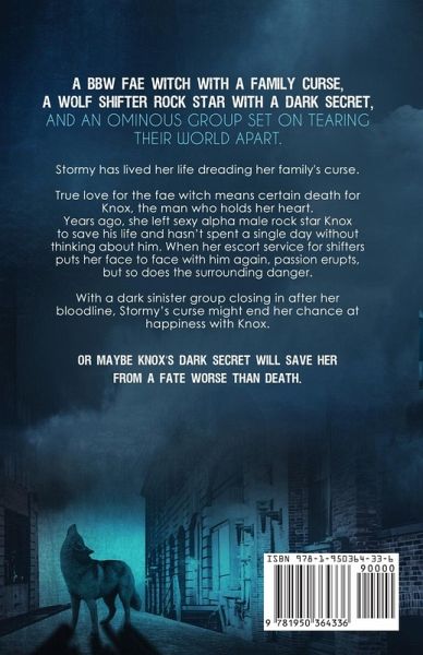 A bbw fae witch with a family curse, a wolf shifter rock star with a dark secret, and an ominous group set on tearing their world apart... Stormy has lived her life dreading her family's curse. True love for the fae witch means certain death for Knox, the man who holds her heart. Years ago, she left sexy alpha male rock star Knox to save his life and hasn't spent a single day without thinking about him. When her escort service for shifters puts her face to face with him again, passion erupts, but so does the surrounding danger. With a dark sinister group closing in after her bloodline, Stormy's curse might end her chance at happiness with Knox. Or maybe Knox's dark secret will save her from a fate worse than death.