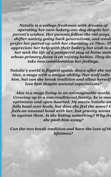 Natalie is a college freshman with dreams of operating her own bakery one day despite her parent's wishes. Her parents follow the old ways, a shifter society going back generations, and would prefer her paired up with her charming ex Theo. They appreciate her help with their bakery but wish to see her seek the life of a pampered stay at home mom whose primary focus is on raising babies. They don't take into consideration her feelings. Natalie's world is flipped upside down after she meets Alex, a mage with a unique ability. Her wolf calls to him, but can she break tradition and allow herself to love him despite societal expectations? Alex is a mage living in an unimaginable world. Growing up in a non-traditional family, he is more optimistic and open-hearted. He meets Natalie and falls head over heels, but does she feel the same? He feels an unusual bond with her, but gravity seems to be against them. Is she hiding something? Why does she push him away? Can the two break tradition and have the love of their lifetimes?