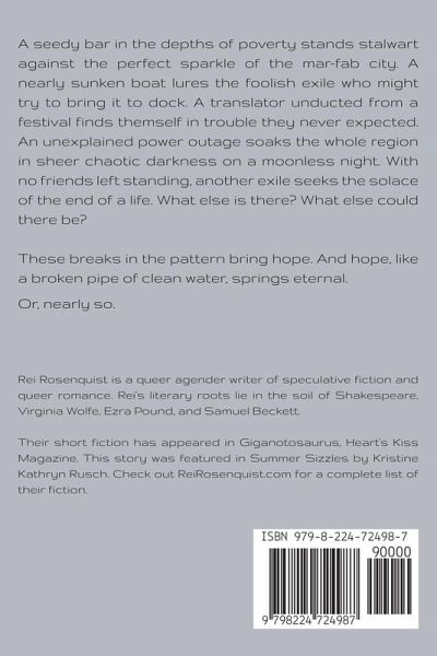 A seedy bar in the depths of poverty stands stalwart against the perfect sparkle of the mar-fab city. A nearly sunken boat lures the foolish exile who might try to bring it to dock. A translator unducted from a festival finds themself in trouble they never expected. An unexplained power outage soaks the whole region in sheer chaotic darkness on a moonless night. With no friends left standing, another exile seeks the solace of the end of a life. What else is there? What else could there be? These breaks in the pattern bring hope. And hope, like a broken pipe of clean water, springs eternal. Or, nearly so.