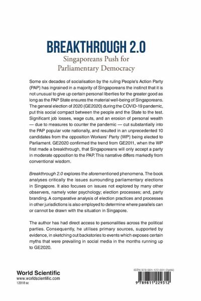 Some six decades of socialisation by the ruling People's Action Party (PAP) has ingrained in a majority of Singaporeans the instinct that it is not unusual to give up certain personal liberties for the greater good as long as the PAP State ensures the material well-being of Singaporeans. The general election of 2020 (GE2020) during the COVID-19 pandemic, put this social compact between the people and the State to the test. Significant job losses, wage cuts, and an erosion of personal wealth - due to measures to counter the pandemic - cut substantially into the PAP popular vote nationally, and resulted in an unprecedented 10 candidates from the opposition Workers' Party (WP) being elected to Parliament. GE2020 confirmed the trend from GE2011, when the WP first made a breakthrough, that Singaporeans will only accept a party in moderate opposition to the PAP. This narrative differs markedly from conventional wisdom. Breakthrough 2.0 explores the aforementioned phenomena. The book analyses critically the issues surrounding parliamentary elections in Singapore. It also focuses on issues not explored by many other observers, namely voter psychology; election processes; and, party branding. A comparative analysis of election practices and processes in other jurisdictions is also employed to determine where parallels can or cannot be drawn with the situation in Singapore. The author has had direct access to personalities across the political parties. Consequently, he utilises primary sources, supported by evidence, in sketching out backstories to events which exposes certain myths that were prevailing in social media in the months running up to GE2020.