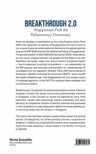 Some six decades of socialisation by the ruling People's Action Party (PAP) has ingrained in a majority of Singaporeans the instinct that it is not unusual to give up certain personal liberties for the greater good as long as the PAP State ensures the material well-being of Singaporeans. The general election of 2020 (GE2020) during the COVID-19 pandemic, put this social compact between the people and the State to the test. Significant job losses, wage cuts, and an erosion of personal wealth - due to measures to counter the pandemic - cut substantially into the PAP popular vote nationally, and resulted in an unprecedented 10 candidates from the opposition Workers' Party (WP) being elected to Parliament. GE2020 confirmed the trend from GE2011, when the WP first made a breakthrough, that Singaporeans will only accept a party in moderate opposition to the PAP. This narrative differs markedly from conventional wisdom. Breakthrough 2.0 explores the aforementioned phenomena. The book analyses critically the issues surrounding parliamentary elections in Singapore. It also focuses on issues not explored by many other observers, namely voter psychology; election processes; and, party branding. A comparative analysis of election practices and processes in other jurisdictions is also employed to determine where parallels can or cannot be drawn with the situation in Singapore. The author has had direct access to personalities across the political parties. Consequently, he utilises primary sources, supported by evidence, in sketching out backstories to events which exposes certain myths that were prevailing in social media in the months running up to GE2020.