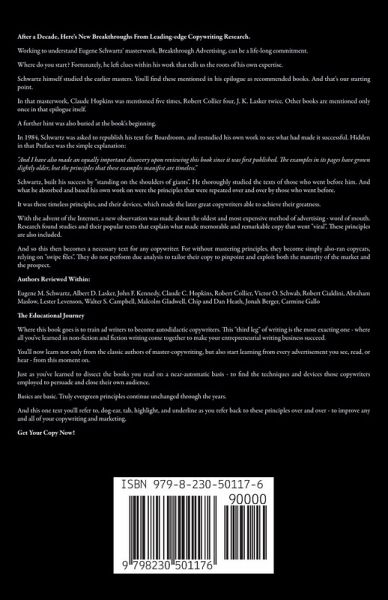 After a Decade, Here's New Breakthroughs From Leading-edge Copywriting Research. Working to understand Eugene Schwartz' masterwork, Breakthrough Advertising, can be a life-long commitment. Where do you start? Fortunately, he left clues within his work that tells us the roots of his own expertise. Schwartz himself studied the earlier masters. You'll find these mentioned in his epilogue as recommended books. And that's our starting point. In that masterwork, Claude Hopkins was mentioned five times, Robert Collier four, J. K. Lasker twice. Other books are mentioned only once in that epilogue itself. A further hint was also buried at the book's beginning. In 1984, Schwartz was asked to republish his text for Boardroom. and restudied his own work to see what had made it successful. Hidden in that Preface was the simple explanation: "And I have also made an equally important discovery upon reviewing this book since it was first published. The examples in its pages have grown slightly older, but the principles that these examples manifest are timeless." Schwartz, built his success by "standing on the shoulders of giants". He thoroughly studied the texts of those who went before him. And what he absorbed and based his own work on were the principles that were repeated over and over by those who went before. It was these timeless principles, and their devices, which made the later great copywriters able to achieve their greatness. With the advent of the Internet, a new observation was made about the oldest and most expensive method of advertising - word of mouth. Research found studies and their popular texts that explain what made memorable and remarkable copy that went "viral". These principles are also included. And so this then becomes a necessary text for any copywriter. For without mastering principles, they become simply also-ran copycats, relying on "swipe files". They do not perform due analysis to tailor their copy to pinpoint and exploit both the maturity of the market and the prospect. Authors Reviewed Within: Eugene M. Schwartz, Albert D. Lasker, John F. Kennedy, Claude C. Hopkins, Robert Collier, Victor O. Schwab, Robert Cialdini, Abraham Maslow, Lester Levenson, Walter S. Campbell, Malcolm Gladwell, Chip and Dan Heath, Jonah Berger, Carmine Gallo The Educational Journey Where this book goes is to train ad writers to become autodidactic copywriters. This "third leg" of writing is the most exacting one - where all you've learned in non-fiction and fiction writing come together to make your entrepreneurial writing business succeed. You'll now learn not only from the classic authors of master-copywriting, but also start learning from every advertisement you see, read, or hear - from this moment on. Just as you've learned to dissect the books you read on a near-automatic basis - to find the techniques and devices those copywriters employed to persuade and close their own audience. Basics are basic. Truly evergreen principles continue unchanged through the years. And this one text you'll refer to, dog-ear, tab, highlight, and underline as you refer back to these principles over and over - to improve any and all of your copywriting and marketing.