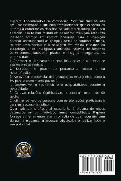 Ruptura: Encontrando Seu Verdadeiro Potencial Num Mundo em Transformação é um guia transformador que capacita os leitores a enfrentar os desafios da vida e a desbloquear o seu potencial oculto num mundo em constante evolução. Este livro inovador oferece um roteiro poderoso para a evolução pessoal, aprofundando as complexidades da natureza humana, as estruturas sociais e a paisagem em rápida mudança da tecnologia e da inteligência artificial. Através de histórias convincentes, sabedoria prática e insights instigantes, os leitores irão: 1. Aprender a ultrapassar crenças limitadoras e a libertar-se das restrições sociais. 2. Descobrir o poder do pensamento crítico e da autorreflexão. 3. Aproveitar o potencial das tecnologias emergentes, como a IA, para o crescimento pessoal. 4. Desenvolver a resiliência e a adaptabilidade perante a adversidade. 5. Cultivar relações significativas e construir uma rede de apoio. 6. Alinhar os valores pessoais com as aspirações profissionais para um sucesso holístico. Quer seja um profissional experiente à procura de novos patamares ou um indivíduo numa encruzilhada, Ruptura fornece as ferramentas e a inspiração de que necessita para abraçar a mudança, ultrapassar obstáculos e realizar todo o seu potencial. Este livro desafia os leitores a questionarem a sabedoria convencional, a confrontarem verdades incómodas e a embarcarem numa viagem de autodescoberta e capacitação. Num mundo onde a mudança é a única constante, Ruptura serve como um guia indispensável para aqueles que estão dispostos a evoluir, adaptar-se e prosperar. Não se limite a sobreviver neste mundo em mudança - aprenda a prosperar e a deixar a sua marca. A sua viagem de transformação pessoal começa aqui. Descubra os segredos para realizar o seu verdadeiro potencial e criar uma vida de objectivos e realização. Mais do que um simples livro, Ruptura é um catalisador de mudança que o inspirará a alcançar novos patamares e a atingir o sucesso com que sempre sonhou.