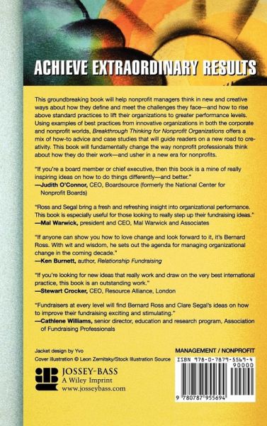 This groundbreaking book will help nonprofit managers think in new and creative ways about how they define and meet the challenges they face--and how to rise above standard practices to lift their organizations to greater performance levels. Using examples of best practices from innovative organizations in both the corporate and nonprofit worlds, Breakthrough Thinking for Nonprofit Organizations offers a mix of "how-to" advice and case studies that will guide readers on a new road to creativity. This book will fundamentally change the way nonprofit professionals think about how they do their work--and usher in a new era for nonprofits. "If you're a board member or chief executive, then this book is a mine of really inspiring ideas on how to do things differently? and better." ? Judith O'Connor, CEO, Boardsource (formerly NCNB) "Ross and Segal bring a fresh and refreshing insight into organizational performance. This book is especially useful to anyone looking ready to step up their fundraising ideas." ? Mal Warwick, president and CEO, Mal Warwick and Associates "If anyone can show you how to love change and look forward to it, it's Bernard Ross. With wit and wisdom, he sets out the agenda for managing organizational change in the coming decade." ? Ken Burnett, author, Relationship Fundraising "If you're looking for new ideas that really work and draw on the very best international practice, this book is an outstanding work." ? Stewart Crocker, CEO, Resource Alliance, London