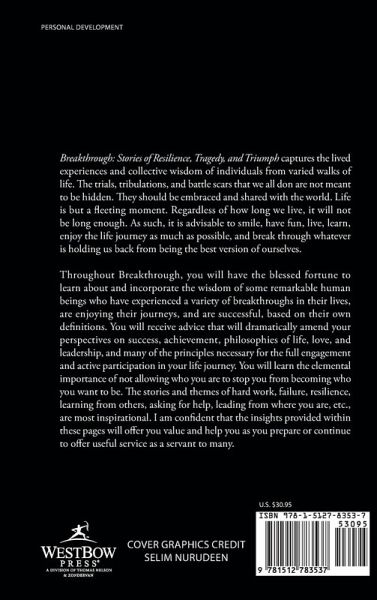 Breakthrough: Stories of Resilience, Tragedy, and Triumph captures the lived experiences and collective wisdom of individuals from varied walks of life. The trials, tribulations, and battle scars that we all don are not meant to be hidden. They should be embraced and shared with the world. Life is but a fleeting moment. Regardless of how long we live, it will not be long enough. As such, it is advisable to smile, have fun, live, learn, enjoy the life journey as much as possible, and break through whatever is holding us back from being the best version of ourselves. Throughout Breakthrough, you will have the blessed fortune to learn about and incorporate the wisdom of some remarkable human beings who have experienced a variety of breakthroughs in their lives, are enjoying their journeys, and are successful, based on their own definitions. You will receive advice that will dramatically amend your perspectives on success, achievement, philosophies of life, love, and leadership, and many of the principles necessary for the full engagement and active participation in your life journey. You will learn the elemental importance of not allowing who you are to stop you from becoming who you want to be. The stories and themes of hard work, failure, resilience, learning from others, asking for help, leading from where you are, etc., are most inspirational. I am confident that the insights provided within these pages will offer you value and help you as you prepare or continue to offer useful service as a servant to many.