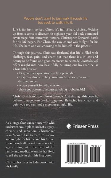 People don't want to just walk through life but seek to walk into it. Life is far from perfect. Often, it's full of hard choices. Waking up from a coma to discover his eighteen-year-old body contained seven stage-four cancerous tumors, Christopher Stewart's battle for his life began. For Chris, the easy choice was to fight for his life. The hard one was choosing to be himself in the process. Through this journey, Chris saw firsthand that life is filled with challenge, fear, pain, and chaos but that there is also love and beauty to be found and good memories to be made. Breakthrough offers insight into how beautifully haunting our lives can be, as Chris tells how to: - let go of the expectations to be a pretender - every day choose to be yourself-the person you were destined to be - accept yourself for who you are - chase your dreams, because anything is obtainable! Chris was able to make a breakthrough. And through this book he believes that you can breakthrough too. By facing fear, chaos, and pain, you too can find a more meaningful life.