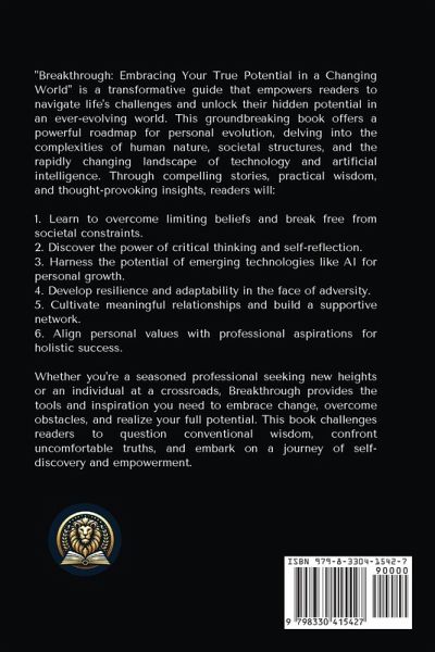 "Breakthrough: Embracing Your True Potential in a Changing World" is a transformative guide that empowers readers to navigate life's challenges and unlock their hidden potential in an ever-evolving world. This groundbreaking book offers a powerful roadmap for personal evolution, delving into the complexities of human nature, societal structures, and the rapidly changing landscape of technology and artificial intelligence. Through compelling stories, practical wisdom, and thought-provoking insights, readers will: 1. Learn to overcome limiting beliefs and break free from societal constraints. 2. Discover the power of critical thinking and self-reflection. 3. Harness the potential of emerging technologies like AI for personal growth. 4. Develop resilience and adaptability in the face of adversity. 5. Cultivate meaningful relationships and build a supportive network. 6. Align personal values with professional aspirations for holistic success. Whether you're a seasoned professional seeking new heights or an individual at a crossroads, Breakthrough provides the tools and inspiration you need to embrace change, overcome obstacles, and realize your full potential. This book challenges readers to question conventional wisdom, confront uncomfortable truths, and embark on a journey of self-discovery and empowerment. In a world where change is the only constant, Breakthrough serves as an indispensable guide for those willing to evolve, adapt, and thrive. Don't just survive in this changing world - learn to thrive and make your mark. Your journey of personal transformation begins here. Discover the secrets to realizing your true potential and creating a life of purpose and fulfillment. "More than just a book, Breakthrough is a catalyst for change that will inspire you to reach new heights and achieve the success you've always dreamed of.