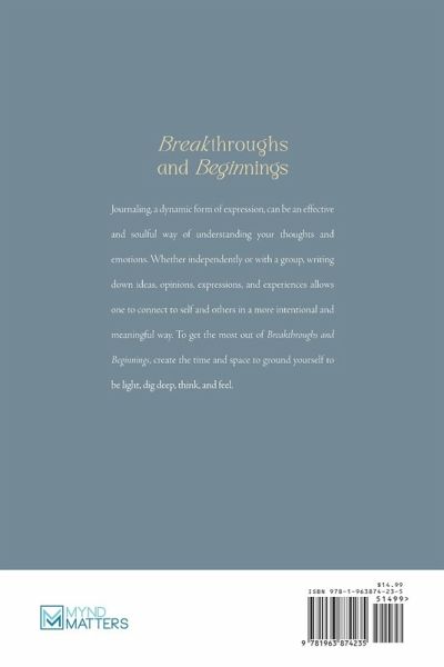 Journaling, a dynamic form of expression, can be an effective and soulful way of understanding your thoughts and emotions. Whether independently or with a group, writing down ideas, opinions, expressions, and experiences allows one to connect to self and others in a more intentional and meaningful way. To get the most out of Breakthroughs and Beginnings, create the time and space to ground yourself to be light, dig deep, think, and feel.