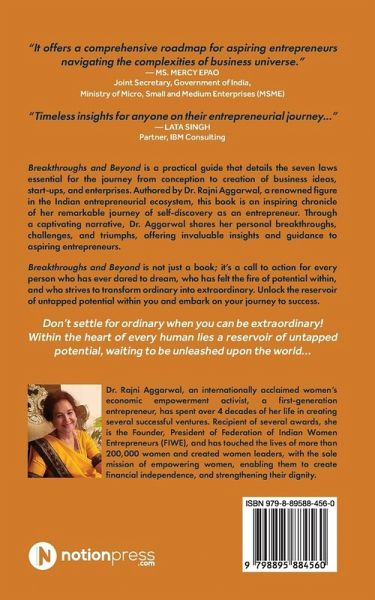 Don't settle for ordinary when you can be extraordinary! Within the heart of every human lies a reservoir of untapped potential, waiting to be unleashed upon the world... Breakthroughs and Beyond is a practical guide that details the seven laws essential for the journey from conception to creation of business ideas, start-ups, and enterprises. Authored by Dr. Rajni Aggarwal, a renowned figure in the Indian entrepreneurial ecosystem, this book is an inspiring chronicle of her remarkable journey of self-discovery as an entrepreneur. Through a captivating narrative, Dr. Aggarwal shares her personal breakthroughs, challenges, and triumphs, offering invaluable insights and guidance to aspiring entrepreneurs. Breakthroughs and Beyond is not just a book; it's a call to action for every person who has ever dared to dream, who has felt the fire of potential within, and who strives to transform ordinary into extraordinary. Unlock the reservoir of untapped potential within you and embark on your journey to success.