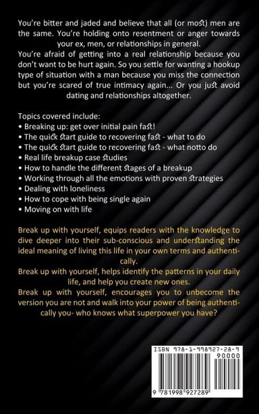 You're bitter and jaded and believe that all (or most) men are the same. You're holding onto resentment or anger towards your ex, men, or relationships in general. You're afraid of getting into a real relationship because you don't want to be hurt again. So you settle for wanting a hookup type of situation with a man because you miss the connection but you're scared of true intimacy again... Or you just avoid dating and relationships altogether. Topics covered include:Breaking up: get over initial pain fast! The quick start guide to recovering fast - what to do The quick start guide to recovering fast - what notto do Real life breakup case studies How to handle the different stages of a breakup Working through all the emotions with proven strategies Dealing with loneliness How to cope with being single again Moving on with life Break up with yourself, equips readers with the knowledge to dive deeper into their sub-conscious and understanding the ideal meaning of living this life in your own terms and authentically.