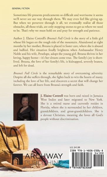 Sometimes life presents predicaments so difficult and worrisome it seems we'll never see our way through them. We may even feel like giving up. But when we persevere through it all, we eventually realize all those obstacles, all those trials, are only stepping-stones to get us where we need to be. That's why we must hold on and pray for strength and patience. Author J. Elaine Cottrell's Breana's Full Circle is the story of a little girl whose life began on the rough side of the mountain. Abandoned at eight months by her mother, Breana is placed in foster care, where she is abused and bullied. Her situation finally brightens when Ambassador Henry Noble and his wife, Penelope, adopt the young girl. Breana thrives in her loving, happy home-it's her dream come true. The family's joy is short-lived. Breana, the love of her family's life, is kidnapped, severely beaten, and left for dead. Breana's Full Circle is the remarkable story of overcoming adversity. Despite all she suffers through, she fights back to win the hearts of many, including the love of her life, and discovers a secret that will change her forever. We can all learn from Breana's strength and faith.