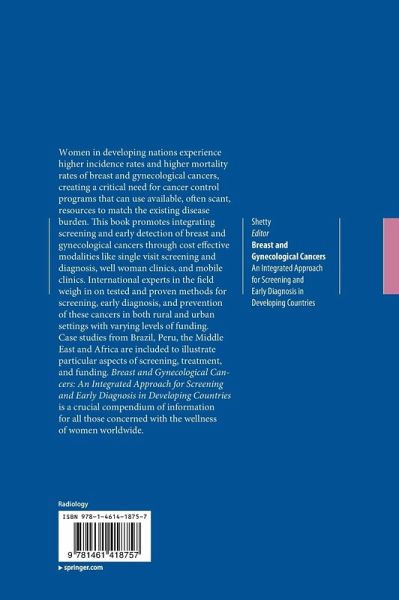Burden of breast and gynecological cancers in low-resource communities.- Breast cancer: pathology, cytology, and core needle biopsy methods for diagnosis.- Gynecological cancers: pathology and cytological methods for diagnosis of gynecological cancers.- Screening and early diagnosis of breast cancer: proven methodology and an optimized strategy for developing countries.- HPV and cervical cancer.- Screening for cervical cancer in low-resource communities.- Ovarian cancer screening and early detection in low- and middle-income countries.- Endometrial cancer: risk factors and early diagnosis in low-resource countries.- Breast and gynecologic cancer prevention in low-resource countries.- Combined screening for breast and gynecological cancers using mobile clinics: the Barretos experience (Brazil).- Cost effectiveness of screening for and early diagnosis of breast and gynecological cancers in low-income countries.- Challenges for breast and gynecological cancer control by early detection in less-developed countries.- Funding for global health care intervention: initiatives aimed at controlling cancer in women in low-resource countries.- Coordinated training on early detection and diagnosis of breast cancer across different levels of health workers: an example from Peru.- Telemedicine in cancer control programs in developing countries. Breast cancer screening and cervical cancer prevention in developing countries: strategies for the future.- Well woman clinic concept: an integrated approach for screening and early diagnosis of breast and gynecological cancers in developing countries.