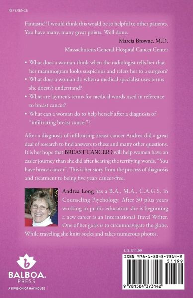 Fantastic!! I would think this would be so helpful to other patients. You have many, many great points. Well done. Marcia Browne, M.D. Massachusetts General Hospital Cancer Center What does a woman think when the radiologist tells her that her mammogram looks suspicious and refers her to a surgeon? What does a woman do when a medical specialist uses terms she doesn't understand? What are laymen's terms for medical words used in reference to breast cancer? What can a woman do to help herself after a diagnosis of "infiltrating breast cancer"? After a diagnosis of infiltrating breast cancer Andrea did a great deal of research to find answers to these and many other questions. It is her hope that BREAST CANCER ? will help women have an easier journey than she did after hearing the terrifying words, "You have breast cancer". This is her story from the process of diagnosis and treatment to being five years cancer-free.