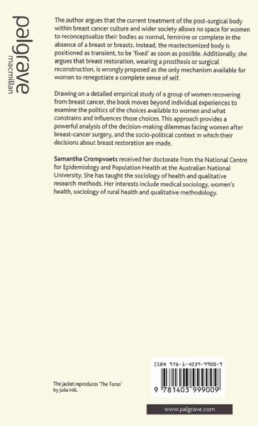 An examination of surgical breast reconstruction which establishes a strong link between, on the one hand, the personal feelings and actions of women with breast cancer, and on the other, powerful discourses and practices of the breast cancer movement.