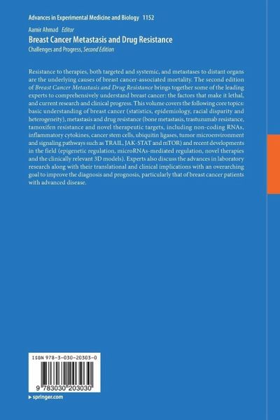Chaper 1: Breast Cancer Statistics: Recent trends.- Chapter 2: Epidemiology of Breast Cancer in Women.- Chapter 3: Health and Racial Disparity in Breast Cancer.- Chapter 4: Breast Cancer: Current perspectives on the disease status.- Chapter 5: Role of Autophagy in Breast Cancer Development and Progression: Opposite Sides of the Same Coin.- Chapter 6: Breast Cancer Heterogeneity in Primary and Metastatic Disease.- Chapter 7: Bone Metastasis of Breast Cancer.- Chapter 8: Therapeutic Options for Metastatic Breast Cancer.- Chapter 9: Chemotherapy and inflammatory cytokine signalling in cancer cells and the tumour microenvironment.- Chapter 10: Current Updates on Trastuzumab Resistance in HER2 overexpressing Breast Cancers.- Chapter 11: Non-coding RNAs as mediators of tamoxifen resistance in breast cancers.- Chapter 12: TRAIL Mediated Signaling in Breast Cancer: Awakening Guardian Angel to Induce Apoptosis and Overcome DrugResistance.- Chapter 13: Current state of platinum complexes for the treatment of advanced and drug-resistant breast cancers.- Chapter 14: Targeting of JAK-STAT Signaling in Breast Cancer: Therapeutic Strategies to Overcome Drug Resistance.- Chapter 15: Role of mTORC1 and mTORC2 in Breast Cancer: Therapeutic Targeting of mTOR and its Partners to Overcome Metastasis and Drug Resistance.- Chapter 16: Epigenetics of Breast Cancer: Clinical Status of Epi-Drugs and Phytochemicals.- Chapter 17: Targeting CSC in a most aggressive subtype of breast cancer TNBC.- Chapter 18: Cross-roads to drug resistance and metastasis in breast cancer: miRNAs regulatory function and biomarker capability.- Chapter 19: NEDD4 Family of E3 Ubiquitin Ligases in Breast Cancer: Spotlight on SMURFs, WWPs and NEDD4.- Chapter 20. Emerging Novel Therapeutics in Triple-Negative Breast Cancer.- Chapter 21.Breast Cancer: Proteolysis and Migration.- Chapter 22: Current and emerging 3D models to study breast cancer.