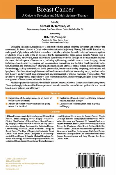 Michael H. Torosian, MD, and a panel of physicians and clinical researchers critically synthesize the wide variety of treatment options available to create a state-of-the-art reference for the management of breast cancer patients. Writing from a multidisciplinary perspective, these authoritative contributors review in the light of the most recent findings the major clinical aspects of breast cancer, including, epidemiology and risk factors, breast imaging, biopsy techniques, breast-conserving surgery and reconstruction, mastectomy, and the latest developments in radiation, hormonal, and chemotherapy. Their expert discussion also addresses special clinical situations (adjuvant chemotherapy, axillary adenopathy as initial presentation, breast cancer during pregnancy, and sarcoma and lymphoma of the breast) and explains current clinical controversies (breast-conserving surgery without radiation therapy, axillary lymph node management, and management of internal mammary lymph nodes).