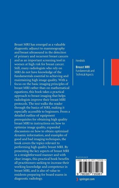 "Breast MRI: Fundamentals and Technical Aspects ... define the technical basis and clinical implementation of breast magnetic resonance (MR) imaging for physicians, technologists, and physicists. ... In summary, Dr Hendrick's book is highly recommended as a reference. ... It should be a required textbook for health care professionals ... . It will be a widely used reference for identifying and correcting image artifacts and for line-tuning protocols. The small size and low cost are attributes that will also promote this book's widespread use." (Steven E. Harms, Radiology, Vol. 253 (1), October, 2009)