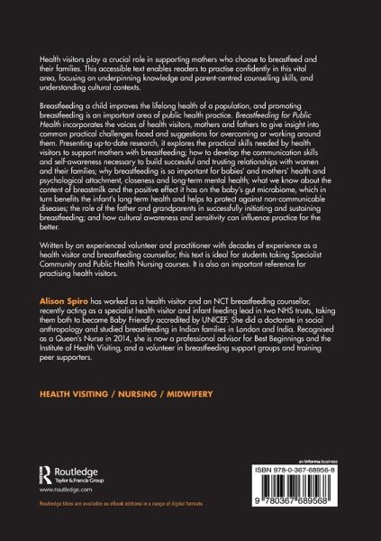Breastfeeding a child improves the lifelong health of a population, and promoting breastfeeding is an important area of public health practice. Breastfeeding for Public Health incorporates the voices of health visitors, mothers and fathers to give insight into common practical challenges faced and suggestions for overcoming or working around them. Presenting up-to-date research, it explores the practical skills needed by health visitors to support mothers with breastfeeding; how to develop the communication skills and self-awareness necessary to build successful and trusting relationships with women and their families; why breastfeeding is so important for babies' and mothers' health and psychological attachment, closeness and long-term mental health; what we know about the content of breastmilk and the positive effect it has on the baby's gut microbiome, which in turn benefits the infant's long-term health and helps to protect against non-communicable diseases; the role of the father and grandparents in successfully initiating and sustaining breastfeeding; and how cultural awareness and sensitivity can influence practice for the better.